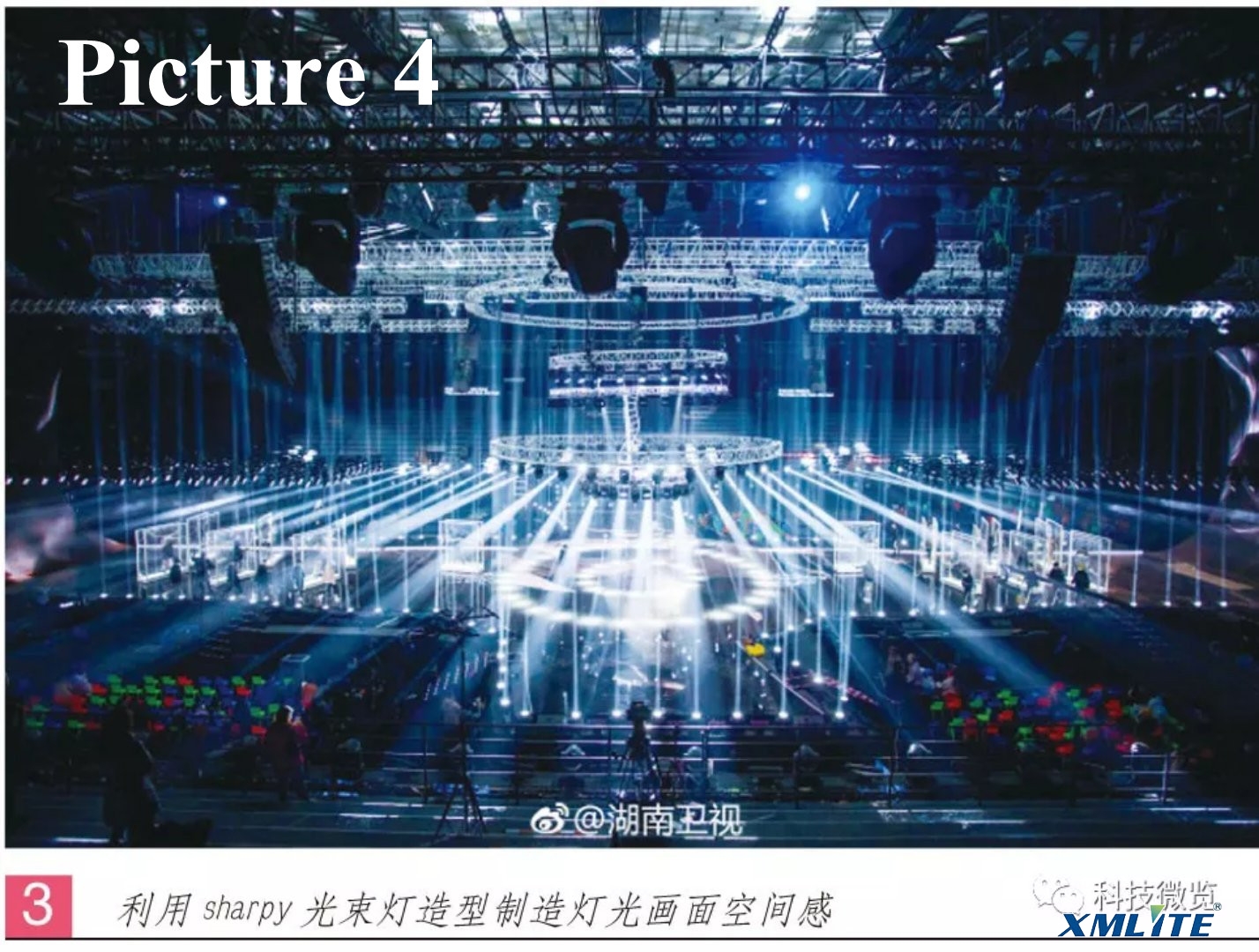 The picture 4 is created by the use 115 pieces of moving head Profile lights.