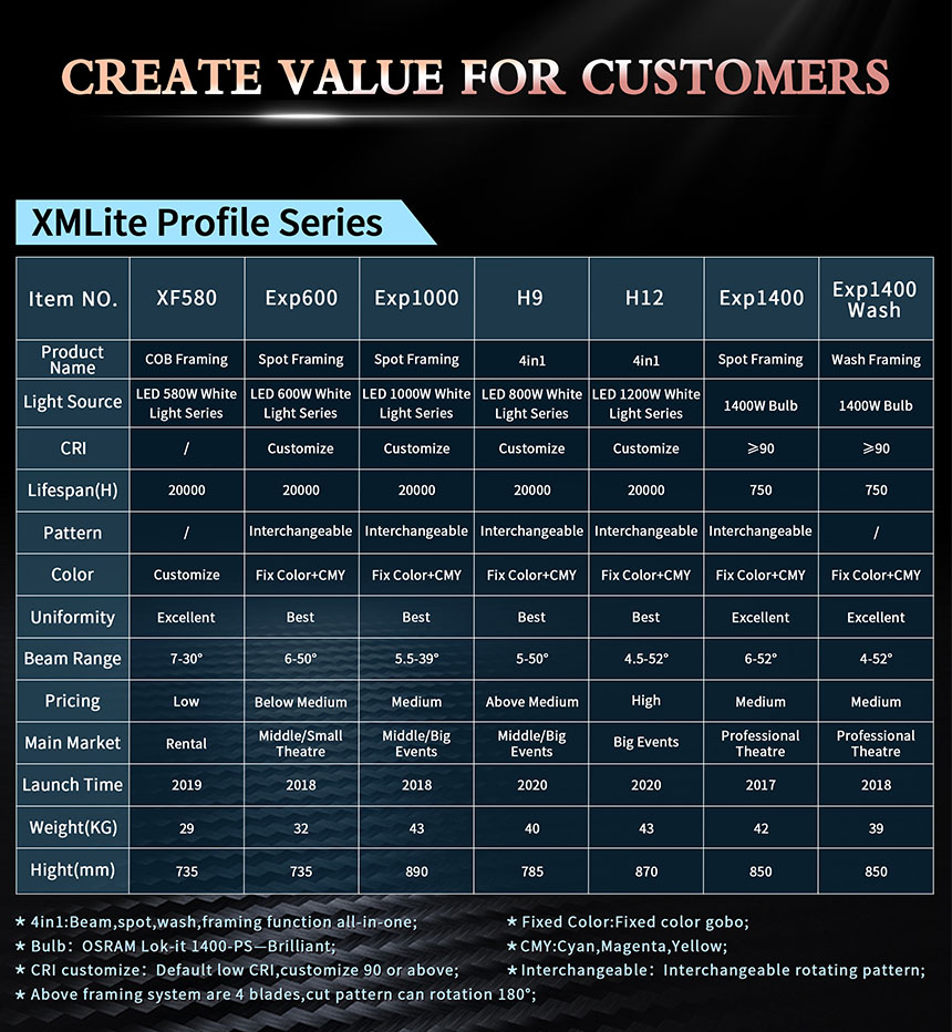 The wash profile stage light is a wash light with a built-inprofile system. Wash light are the main lights for rendering stage effects.They can provide a variety of colors and comprehensive color mixing effects,and require rich and pure colors. After the profile and wash light has abuilt-in cutting system, it can control the shape of the light spot, removestray light, and solve the peripheral astigmatism problem that causes headachesfor lighting engineers.