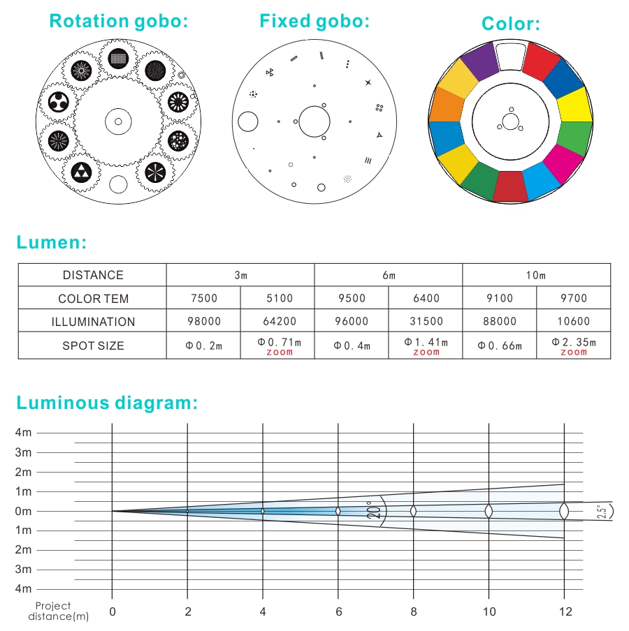 | Gobo | 14 fixed gobo + 9 Rotation gobo |