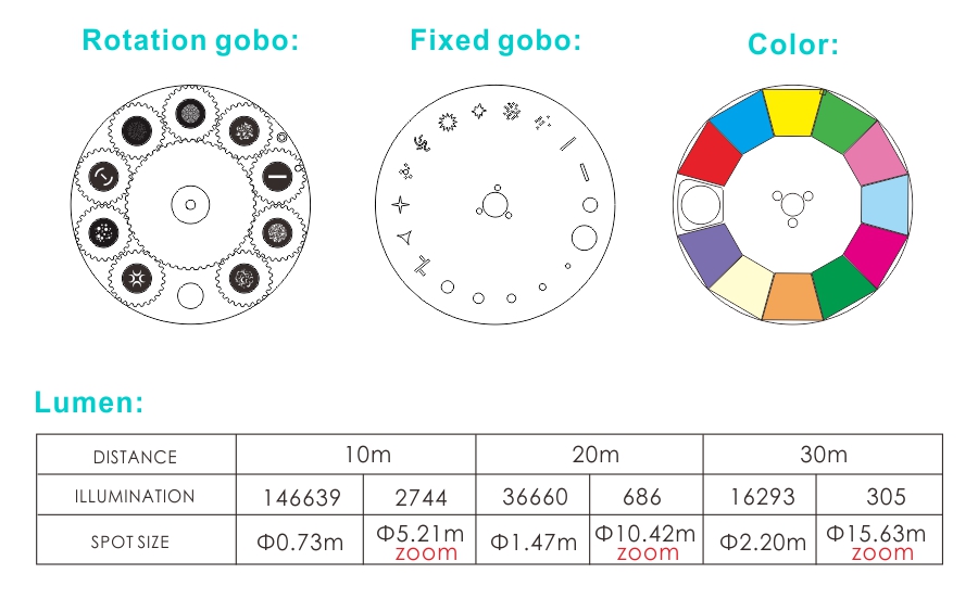 | Gobo | Rotation gobo: 9 gobo+ white,changeable; |