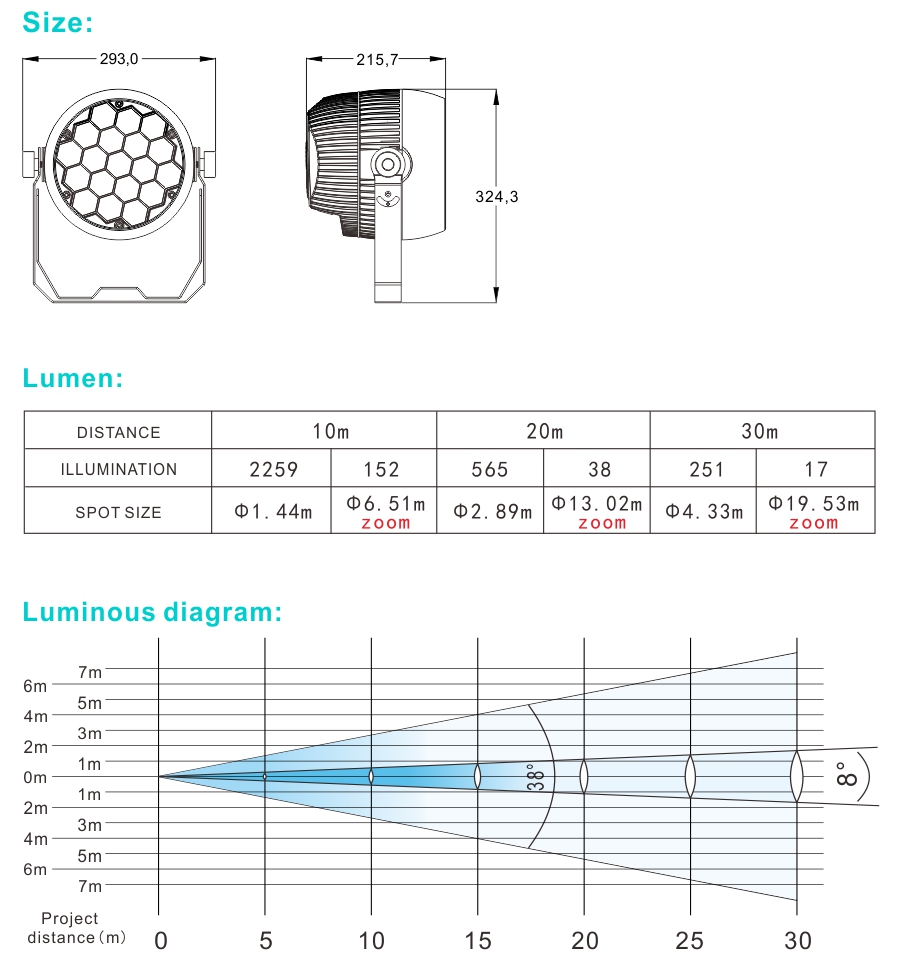 The silicone light guide rod zoom optical system can be closer to the lamp beads and higher light transmittance. The analog fixed focal surface light can be applied to venues with different floor heights.