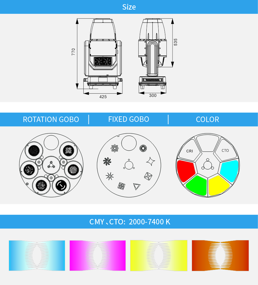 Color wheel: 5 fix colors+CMY+CRI+white.CTO:2000-7400K,Linearly adjustable;
