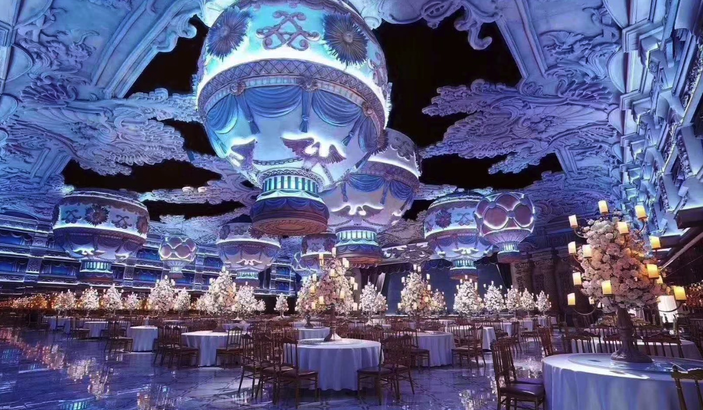 各个布景则采用不同的灯型体现效果,针对桌花、菜品采用LED摇头定点灯,不同的桌花不同的菜品不同的时间不同的造型进行灯光的实时调整;景观上采用LED景观灯,塑造景观的风采氛围;LED变色灯、热气球平板灯的效果则是呼应了空间设计中“诗和远方的理想”!让整个宴会厅灯光动静结合,光影有度。