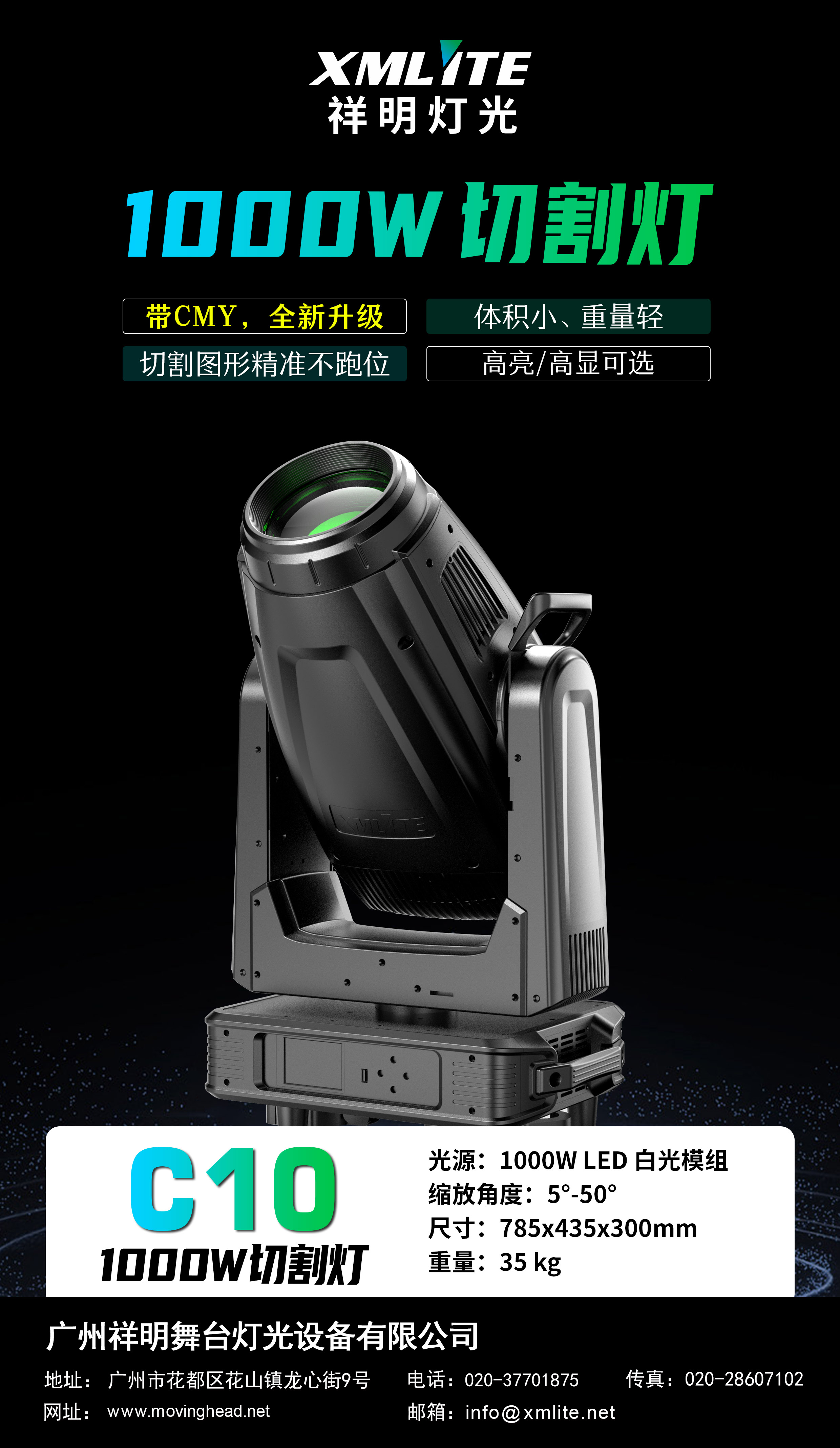 2016年,祥明灯光开始研发切割灯,至今已经8年。早前祥明多款中功率切割灯(XF580与680)定位的是50米以内使用,C10定位的是70米以上面光距离的使用需求,光源采用的是LED1000瓦的白光模组(高显可选)。内部发光芯片和光学镜都是圆形“Circle”,所以命名为C10,10意指光源功率1000瓦。