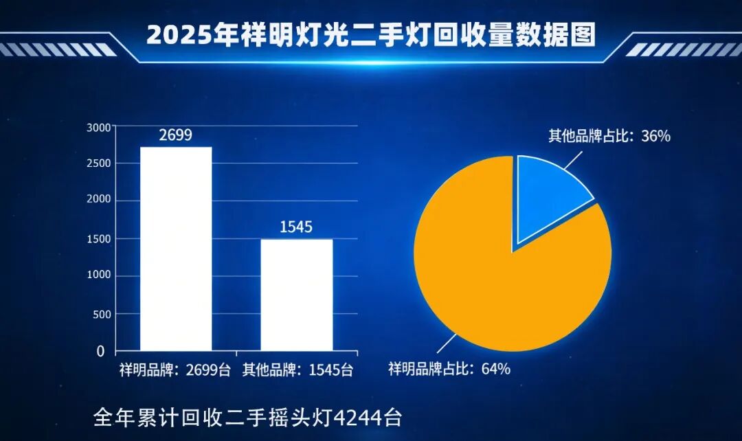2025年,祥明灯光二手灯回收业务实现稳步升级,全年累计回收二手摇头灯4244台。其中,祥明品牌二手摇头灯回收量达2699台,其他品牌二手灯回收量1545台,占总回收量的36%,这些二手摇头灯包括二手LED切割灯、二手光束灯、二手图案光束三合一、二手摇头染色灯等等。这一数据背后,正是舞台灯具生态链非摩尔定律式迭代的直接体现——大量设备未达性能极限便因场景迭代、智能化升级等需求被闲置,形成了庞大的存量市场。而200余家客户的信任选择,不仅印证了行业对标准化、规范化回收渠道的迫切需求,更证明了回收政策是承接存量设备、适配行业迭代节奏的必然选择。目前,祥明灯光已成功将二手舞台灯具远销至10余个海外国家,稳步推进“国内最大二手舞台灯具出口商”的战略目标,让回收业务成为企业适配行业迭代、拓展市场空间的核心抓手。