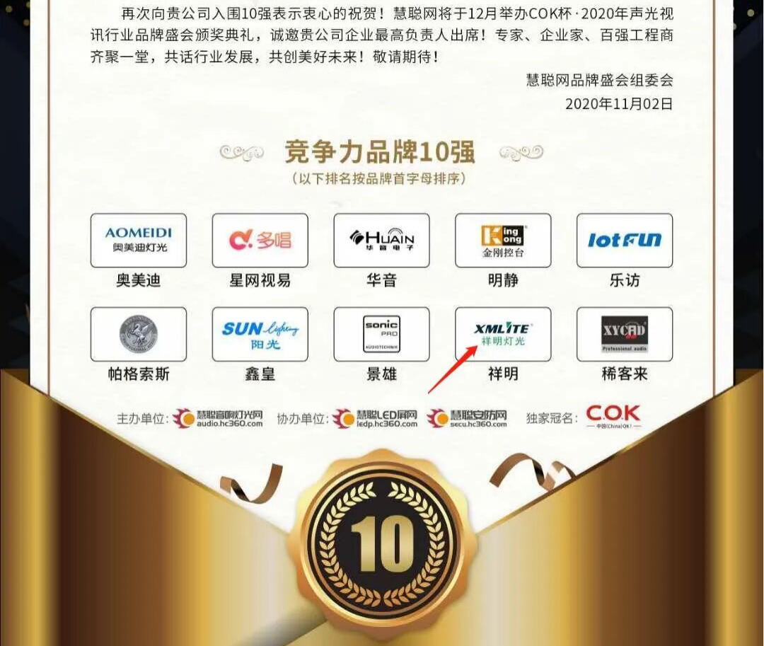 2020年11月2日,慧聪品牌盛会正式公布年度十强榜单。在那年新增的“十佳竞争力品牌”奖项中,祥明灯光的名字赫然在列。