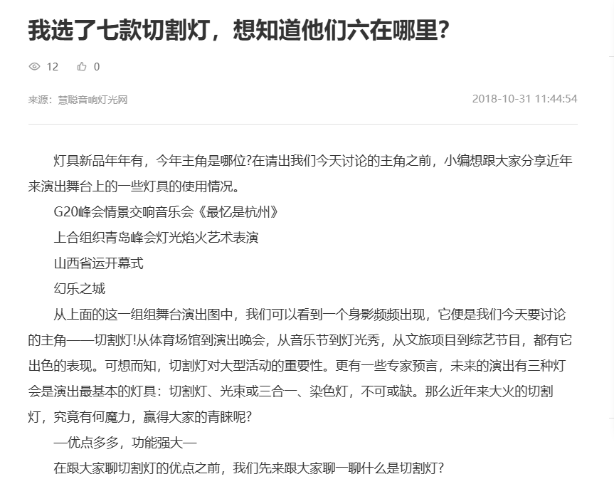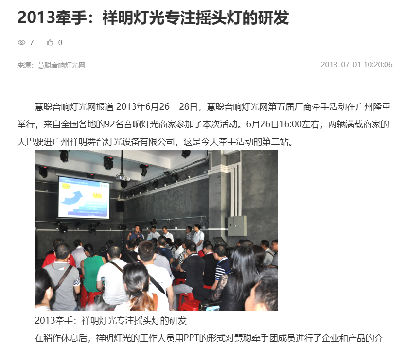 十五年前,仅靠杂志宣传就能轻松获取客户;而今天,这样的方式已不复存在。如今我们需要的是立体化的宣传策略——既要有线上的内容传播,也要有线下的互动交流。其实早在2012年,慧聪就为祥明的200W光束灯做了线上推广。那时的祥明只有二十多名员工,连专职的营销人员都没有。现在回看当年的文章,内容还是典型的“理工男风格”。如果你有兴趣,可以点击链接看一看。