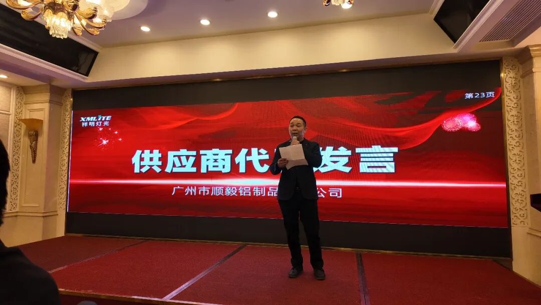 Following this, supplier representatives took the stage one after another, sharing their sentiments regarding cooperation with XMLITE and insights gained from their developmental journey. Mr. Yang, the person in charge of Guangzhou Shunyi Aluminum Products Co., Ltd., affectionately recalled the long-standing cooperative relationship with XMLITE. He shared heartwarming stories of both parties working together to overcome challenges and achieve mutual benefit, and comprehensively demonstrated his team's professional capabilities, core technological advantages, and quality control systems. This provided the guests present with a deeper and more comprehensive understanding of this excellent supplier.