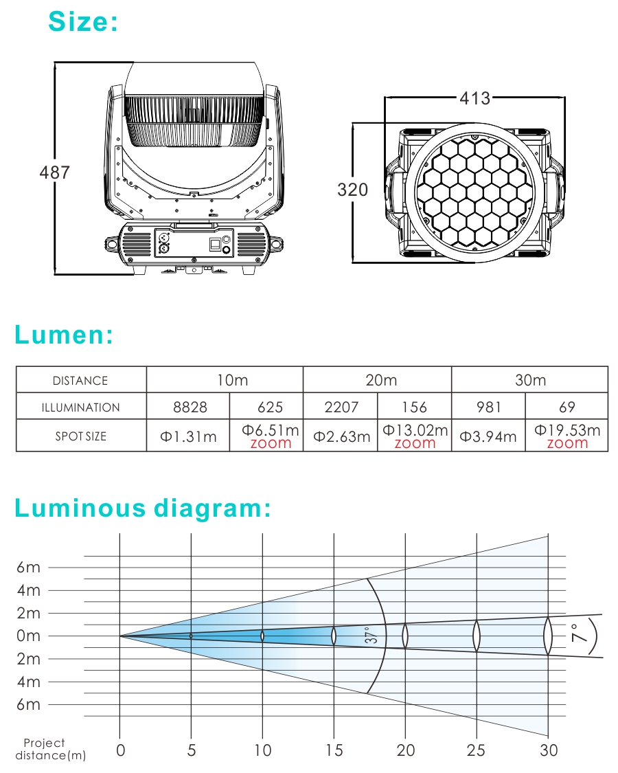 LM560C-37*15W moving head lihgt LED with zoom is based onXMLITE LM560 moving head light wash, which adjusts the layout of the LED bead base plate to realizeinner and outer circle control function; adds handheld power cord and foldinglamp hook which are convenient for mobile performance; adds color correctioninterface, which can realize high standard requirements for color consistencyof customers. This dyeing lamp uses high-density heat dissipation aluminum,excellent heat dissipation performance, low noise.Optical system is made by French Gaggione lens.