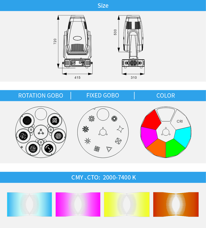 Fixed gobo wheel: 5 fix colors+white+CRI+CMY.CTO:2000-7400K;
