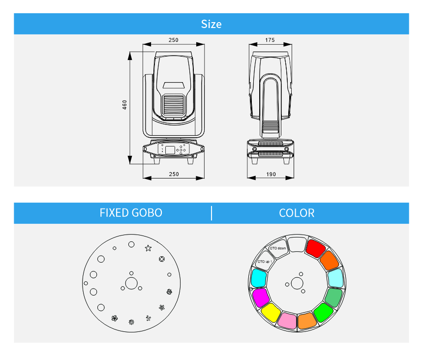 Fixed gobo: 8 gobos+ 2 beam gobos+ 4 stained glass gobos;